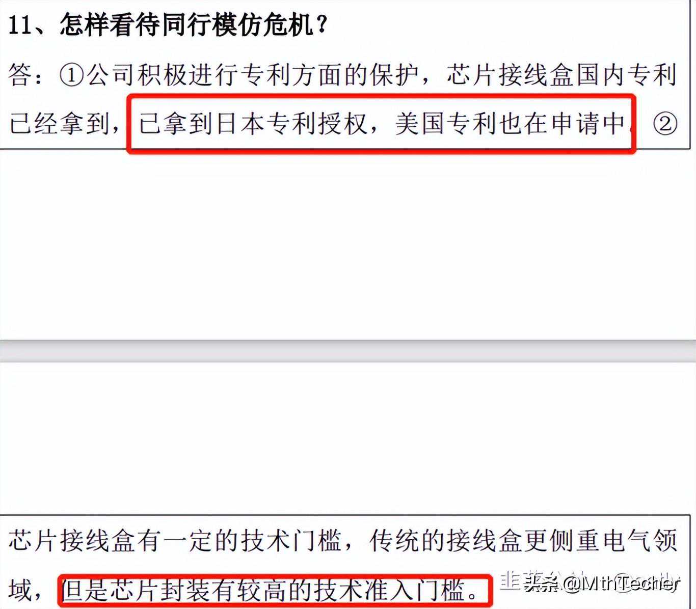 这点担心董秘在纪要中也明确表示:公司拿到一系列国内外权威机构的认证,并且获得专利,高级的芯片接线盒等产品存在较高的技术壁垒。接线盒有行业标准,想要投放市场必须要达到规定,取得认证书。