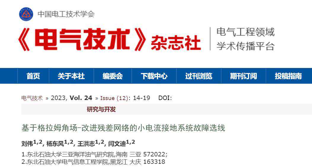 本工作成果发表在《电气技术》,论文标题为“基于格拉姆角场-改进残差网络的小电流接地系统故障选线”,作者为刘伟、杨东风等。