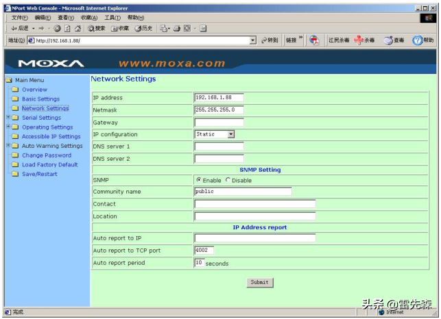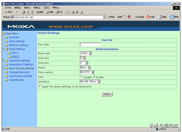 →通讯设备通过串口与串口转以太网的设备连接(以MOXA的Nport为例);