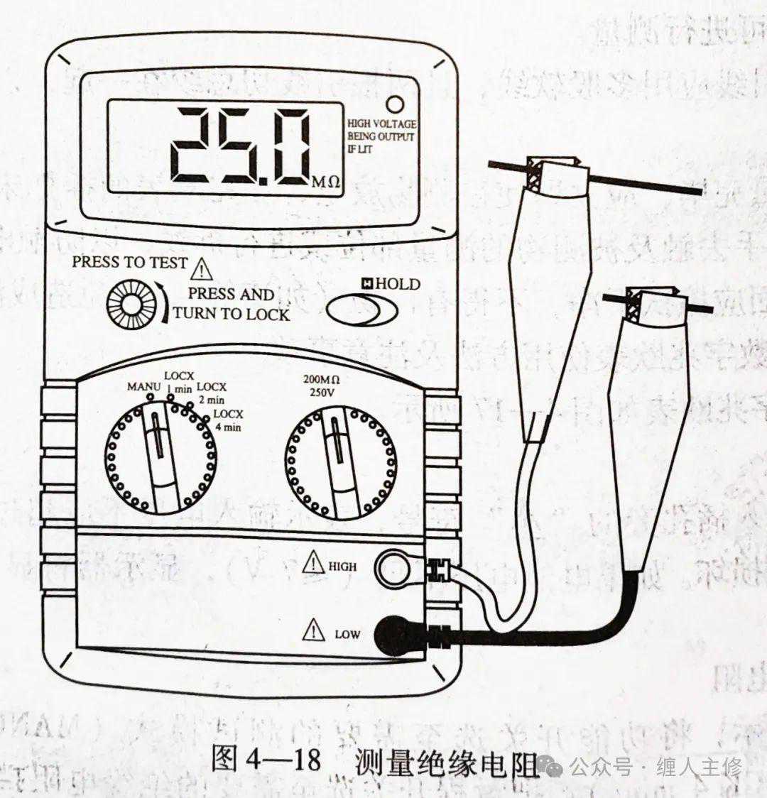 如图4-18所示,将功能开关选至需要的测试模式(MANU、LOCK1min.、LOCK2min.、LOCK4min.),把量程开关选至需要的绝缘电阻挡(200MΩ/250V、200MΩ/500V2000MΩ/1000V)。将黑色测试夹插入LOW插孔,红色测试夹插入HICH插孔、测试夹的另一端连接到被测线路上。按下测试按钮,在手动(MANU)模式,可将测试按钮按下后逆时针旋转锁定,通过LCD显示器读数使用时注意:必须用测试夹将仪表及被测线路连接好后才能按下测试按钮进行测量。测试绝缘的线路必须切断电源,并在测量前确认线路不带电。测量时不可触摸电路。测试按钮按下后,不可旋转量程开关,以免损坏仪表。测试完成后,先将测试按钮放松,稍后才可松开测试夹,因为需先完成内部的系统放电,这样才能避免触电。