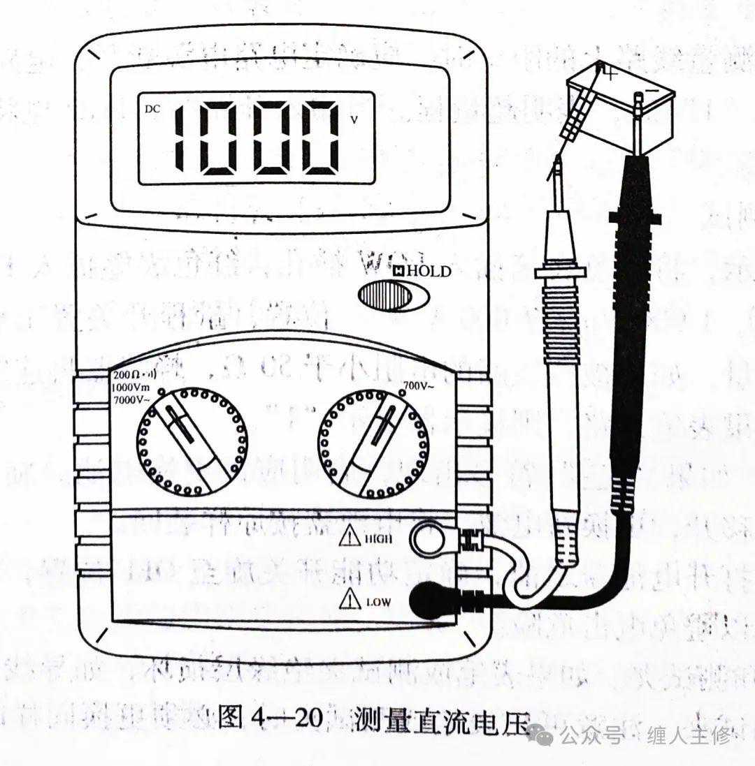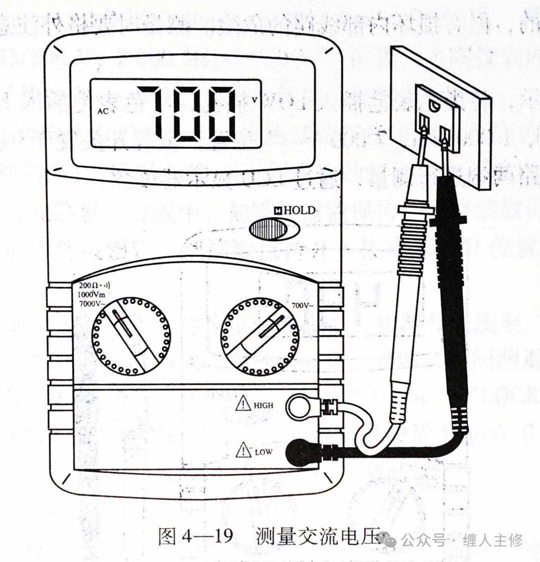 如图4-19所示,将黑色表笔插人LOW插孔,红色表笔插入HIGH插孔,功能开关置于“200Ω,1000Vm,7000V~”位置,量程开关置于700V~挡。将表笔并联在电压源或负载两端进行测量,通过LCD显示器读数。