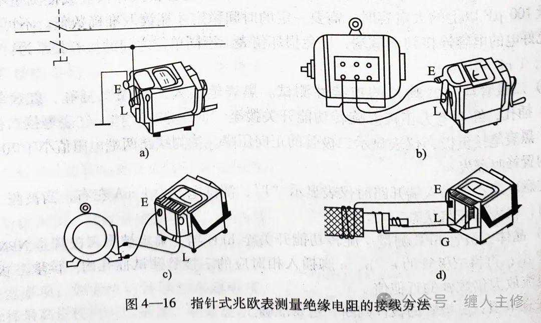 指针式兆欧表有三个接线柱,上面分别标有线路(L)、接地(E)和屏蔽或保护环(G)。用指针式兆欧表测量绝缘电阻时的接法如图4-16所示。