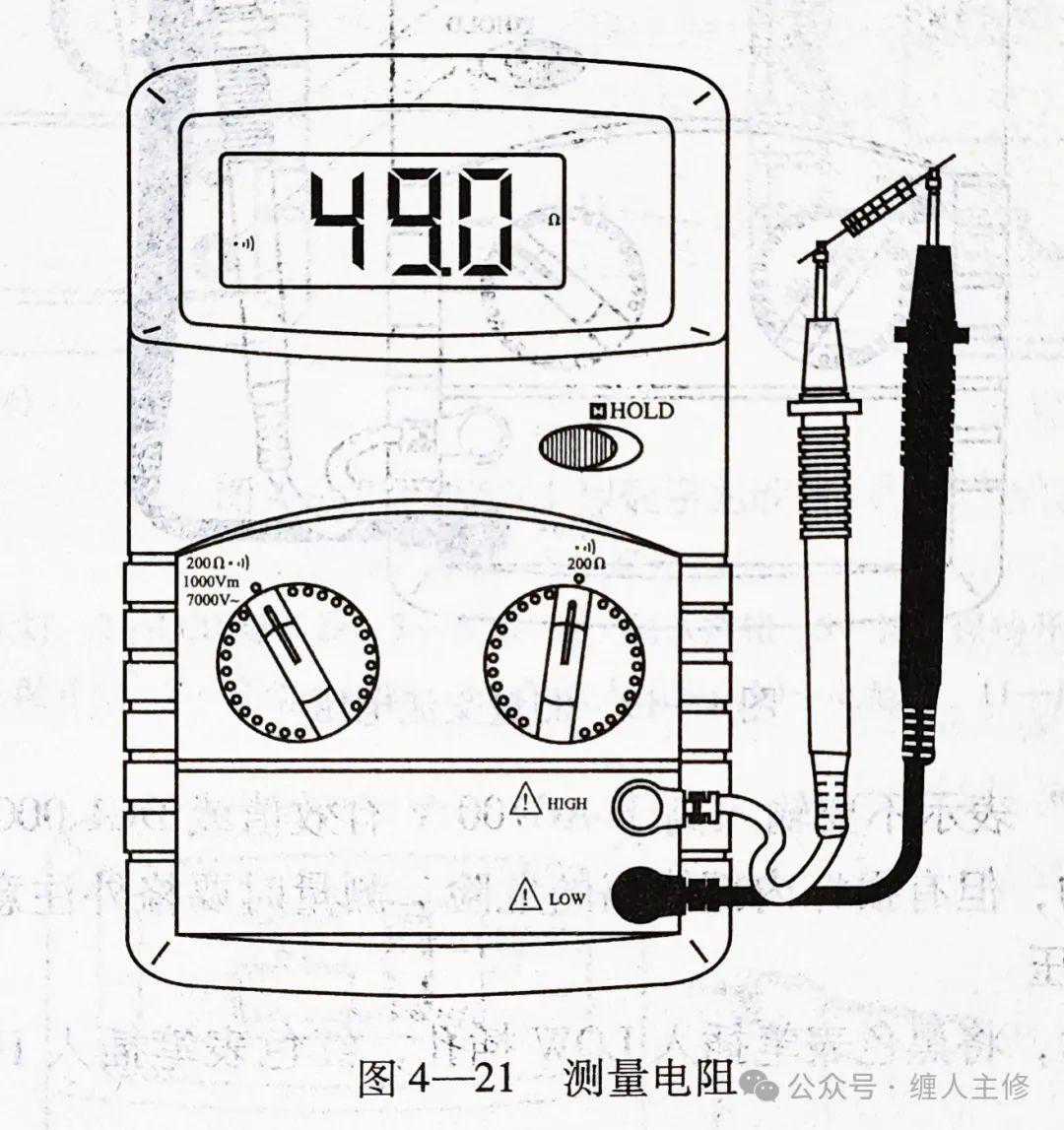 使用注意:在测量线路上的阻抗时,应确定电路电源断开,电路上的电容器完全放电。显示器仅显示“1”时,表明超量程。当输人开路时,LCD也将显示“1”超量程状态。5)线路通断测试如图4-21所示,将黑色表笔插入LOW插孔,红色表笔插入HIGH插孔,功能开关置于“200Ω,1000Vm,7000V”位置,量程开关置于嗡鸣挡。将表笔连接在线路两端进行测量,如果被测线路的电阻小于50Ω,蜂鸣器将连续发声。使用注意:如果表笔开路,则显示器显示“1”6)更换电池