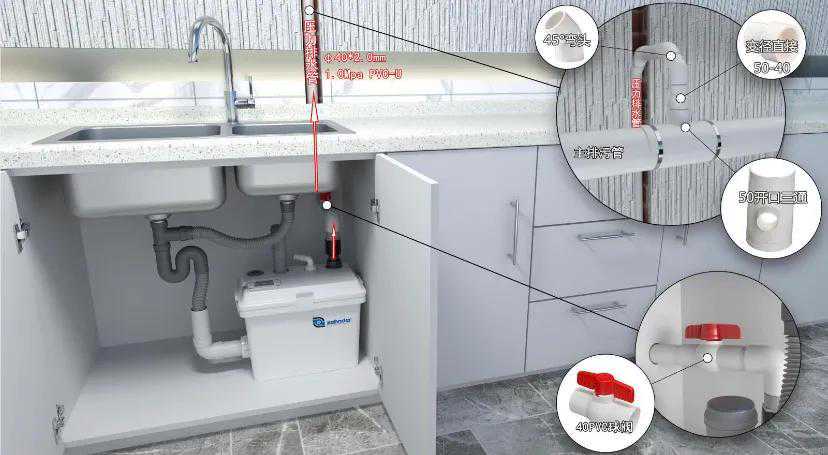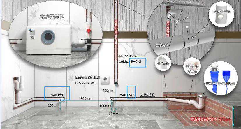 分体式有两个型号,一种是直接马桶的,将马桶和浴室柜的连成到一个机器,高速旋转的设备可以直接将马桶的排泄物粉碎冲走,一种是连接洗衣机的,因为洗衣机排水量比较大,又是三个洗衣机,所以单独配置了一个,不过这也不能同时使用三个洗衣机,要不提升泵的寿命肯定就短了,哎,也是挺娇气的古下水管研究好了,就要研究压力排水管了,需要并联接到主管道上,管道需要pvc_u的,而不是pvc,前者的抗压能力更强。