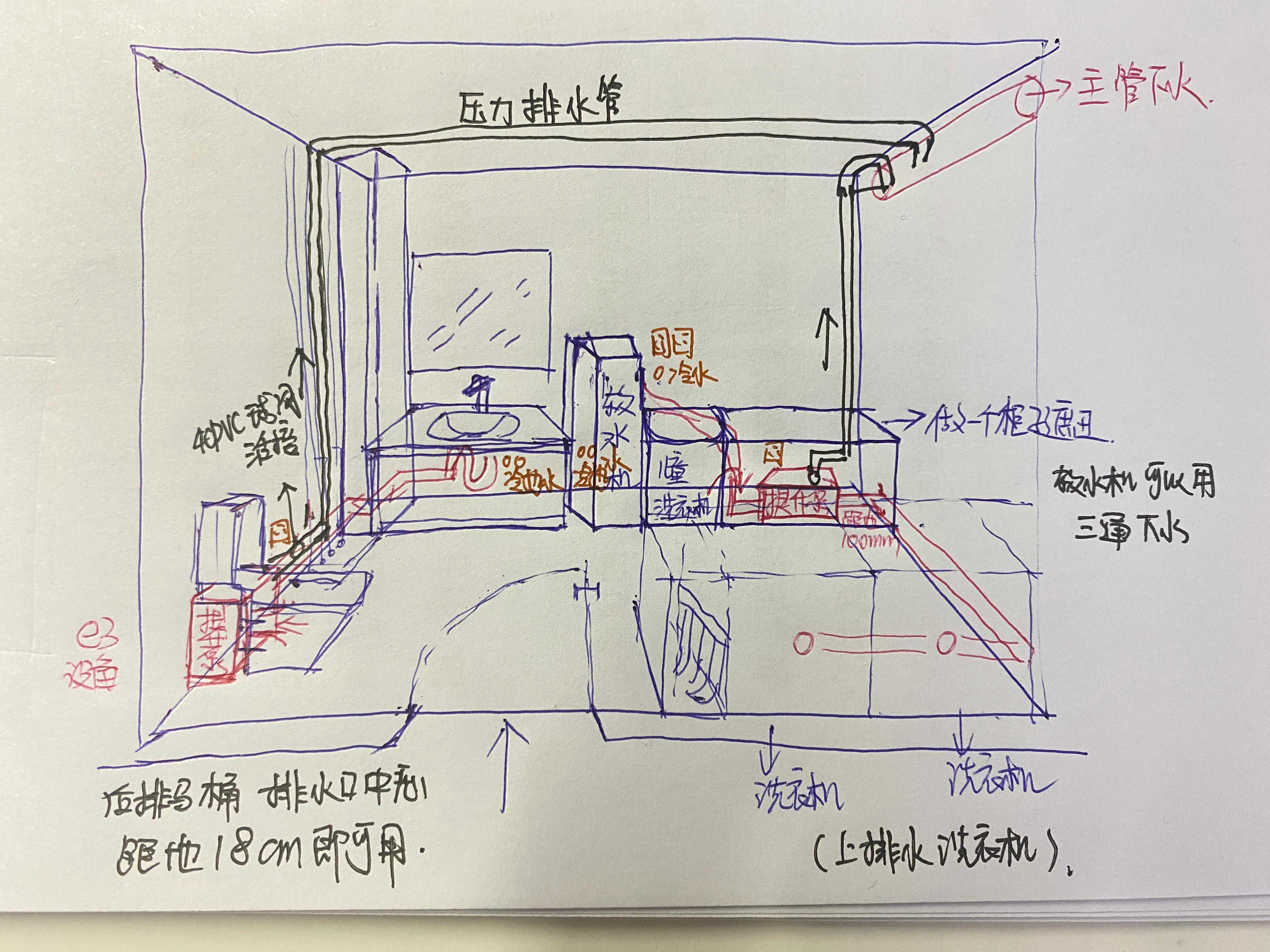 我设计的卫生间配备的洁具有浴室柜,马桶,两个成人洗衣机,一个儿童洗衣机,还有软水机,和空调的冷凝水管,好后悔设计这么多用水的东西有点费钱。[泣不成声]
