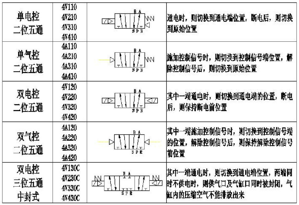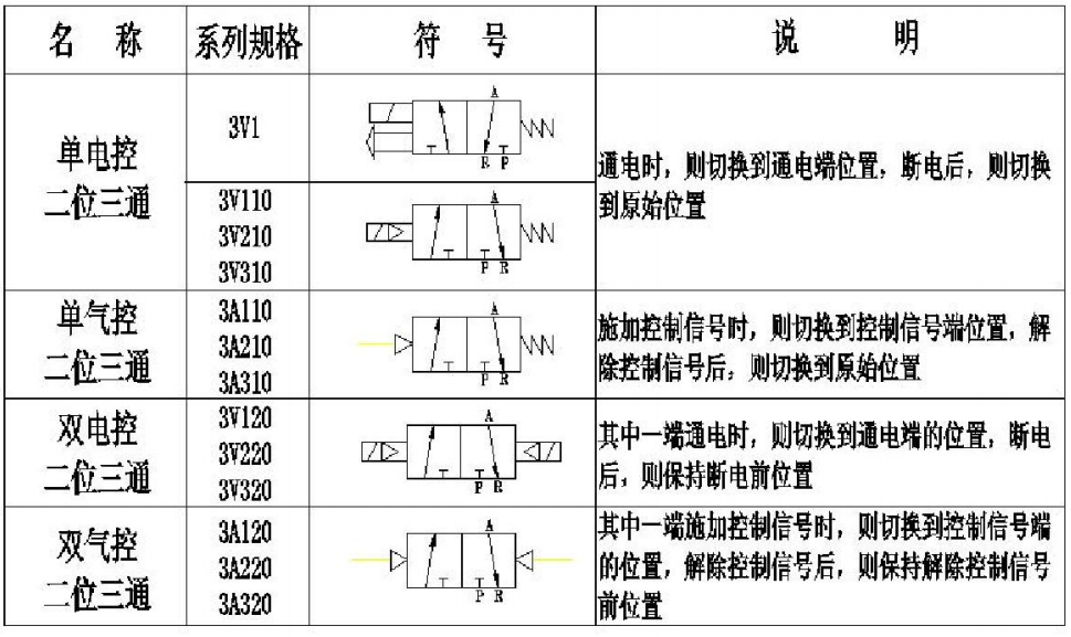 电磁阀系列二位三通、二位五通。②选定机能:根据不同的控制方式选择电