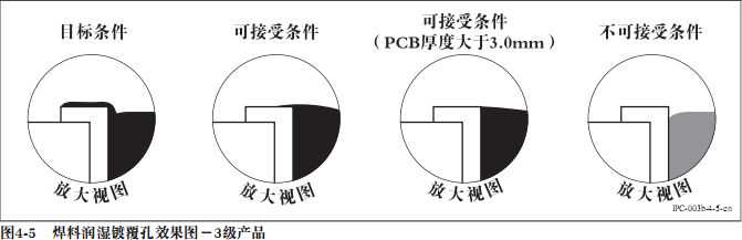 1级和2级产品焊料应当完全润湿镀覆孔孔壁和直径小于1.5mm的塞孔孔壁。