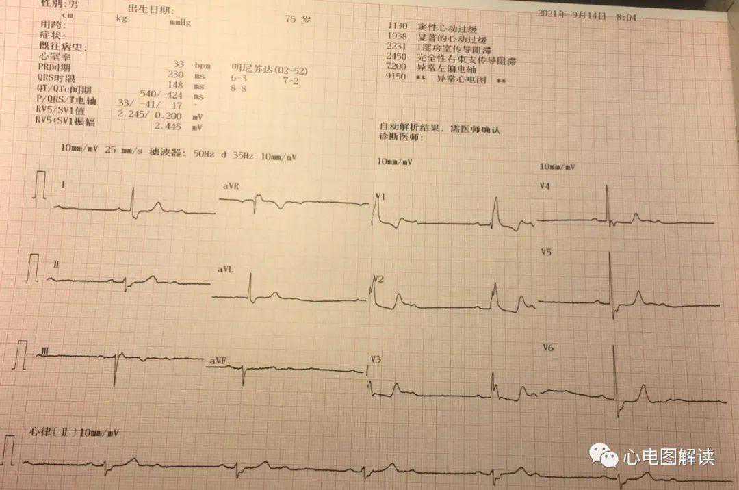窦性P波频率66bpm,PR间期=0.24s,QRS时限0.15s,QRS电轴-41度,V1呈rsR'型,右束支传导阻滞,左前分支阻滞,房室呈2:1下传。提示未下传P波阻滞于左后分支水平可能性大,三支(右束支及左束支的前、后分支)同时出现传导阻滞。