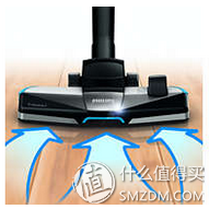 e)triactive+吸嘴:一次应用3种清洁操作:1)其利用专门设计的底板轻轻打开地毯,清除深处的灰尘。2)其利用前部较大的开口吸走大块碎屑。3)其利用两边的侧毛刷清除沿着家具和墙壁的灰尘和污垢
