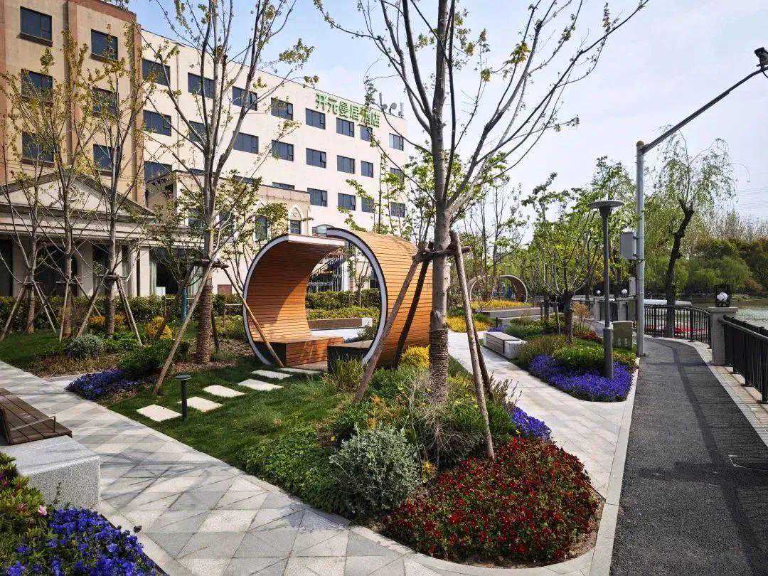 植物配置因地制宜,南侧现状开敞区域增补中层观花乔木,以“美人梅”为主景植物,重点打造春花园,搭配丛生朴树、红梅、茶梅等,结合冬花品种,营造12月至次年5月的观花体验。北部区域植物配置上结合原有大乔木,调整下层地被,配合艺术装置增加中层彩化植物,打造一个多彩、连续且充满活力的河畔空间。