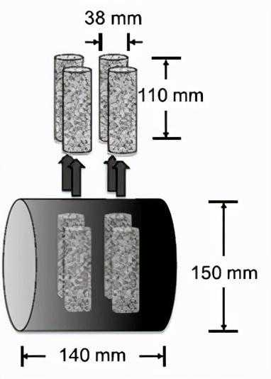 ●动态模量试验钻芯。从φ150mm的旋转压实试件中钻取φ100mm的芯样