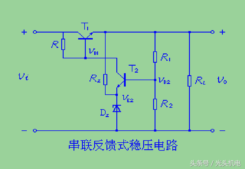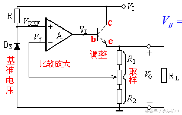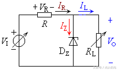 由图可知,输入电压VI增加,必然引起VO的增加即VZ增加,从而使IZ增加,IR增加,使VR增加,从而使输出电压VO减小