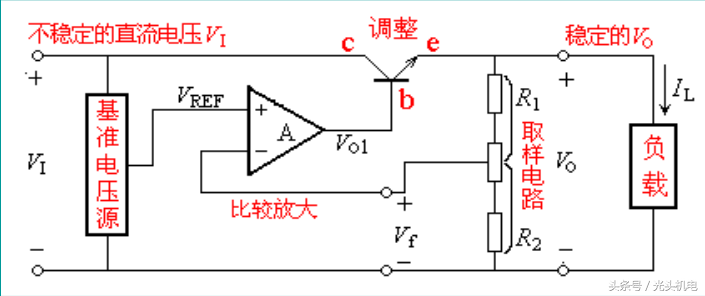 负载电流IL增加,必然会使输入电压VI有所减小,输出电压V0必然有所下降,经过取样电路取出一部分信号Vf与基准源电压VREF比较,获得的误差信号使V01增加,从而使调整管的管压降VCE下降,从而抵消因IL增加,使输入电压减小的影响。