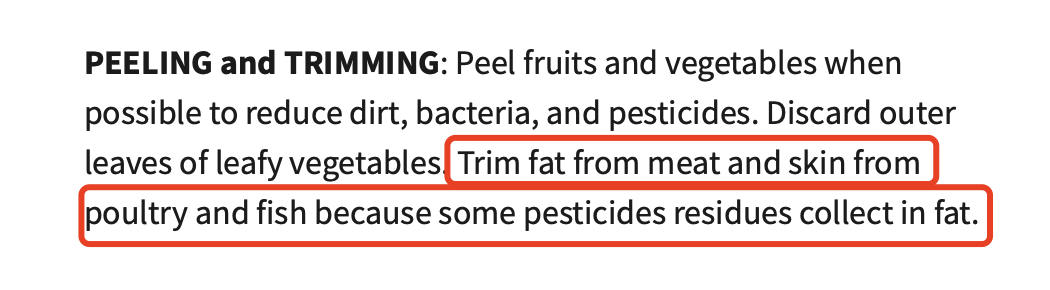 美国环境保护署(EPA)建议,如果你想进一步减少农残摄入,烹调前就把肥肉修剪掉,也少吃鸡皮、鱼皮。[8]