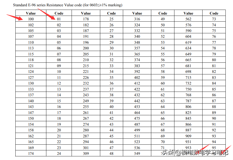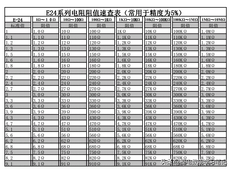 字母n指的是E24,E96等标准中的数值24和96,m的取值范围为0~(n-1);E24有24个基准值,E96有96个基准值,这些基准值再乘以10的x次方,就可以得到各种各样的电阻值了。