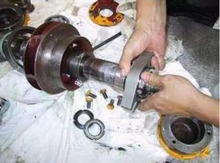 首先使用拉马拆卸联轴器,具体方法是:用专用工具拉马的拉勾钩住联轴器,而其丝杆顶正泵轴中心,慢慢转动扳手,即可将联轴节拆下,在钩拉过程中,可用铜锤或铜棒轻击联轴器。