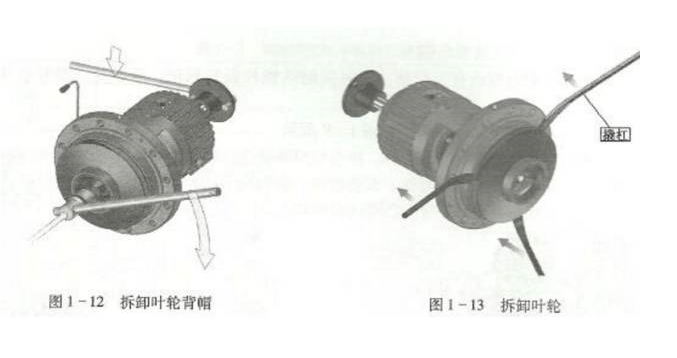 (2)、然后拆卸叶轮背帽,取下叶轮,拆卸前确认背帽旋向,禁止反向用力损坏背帽,如图1-12所示,叶轮用撬杠撬下时,要撬在叶轮的肋板处,以免将叶轮撬裂,如图1-13所示,外观检查叶轮背帽应无咬扣和滑丝现象,否则应修理或更换。