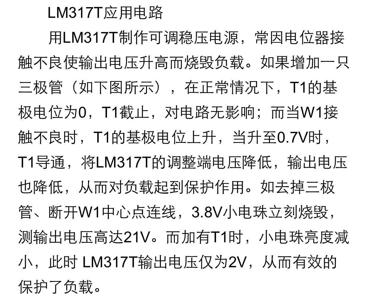 三端可调输出电压集成稳压器一般都不能从0V起调,这是因为稳压器内部设有基准取样电压的缘故,比如基准电压为5V,那么该稳压器起调电压不能低于5V。如果通过外部电路的设置,增加一组负电压给稳压器调整端,抵消基准电压的电位,可以实现三端可调稳压器从0V起调,下面以CW317三端可调集成稳压器为例做介绍。