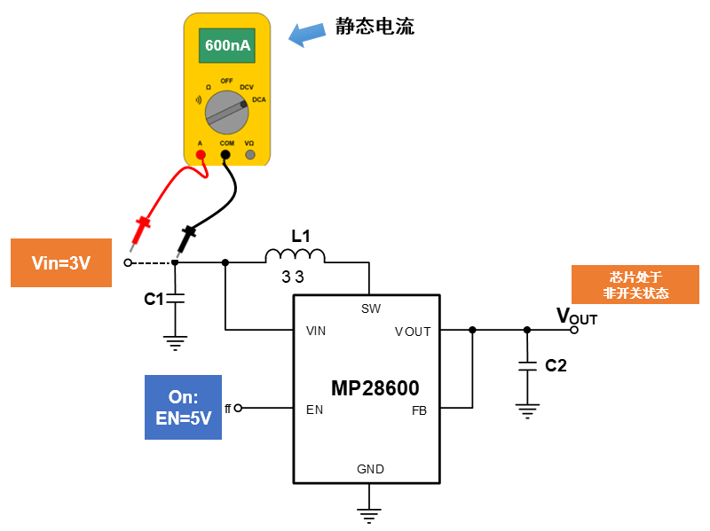 如下图(图4),当芯片(MP28600)使能为高(5V),芯片和电池保持连接,当芯片处于非开关状态或者空载的情况下,从输入端测得的电流即为静态电流。找正品元器件,上唯样商城。