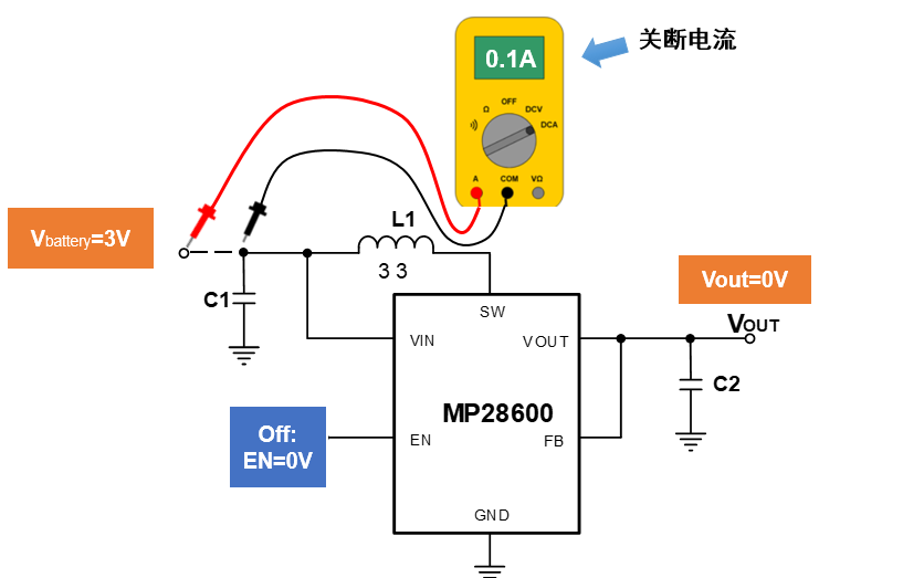 关断电流是芯片从电池抽取的电流,这种电流流动发生于当芯片处于关断状态但仍然和电池保持连接的情况下。如下图,当芯片使能为低(0V),电池输出电压为3V,芯片输入端测得的电流即为关断电流。