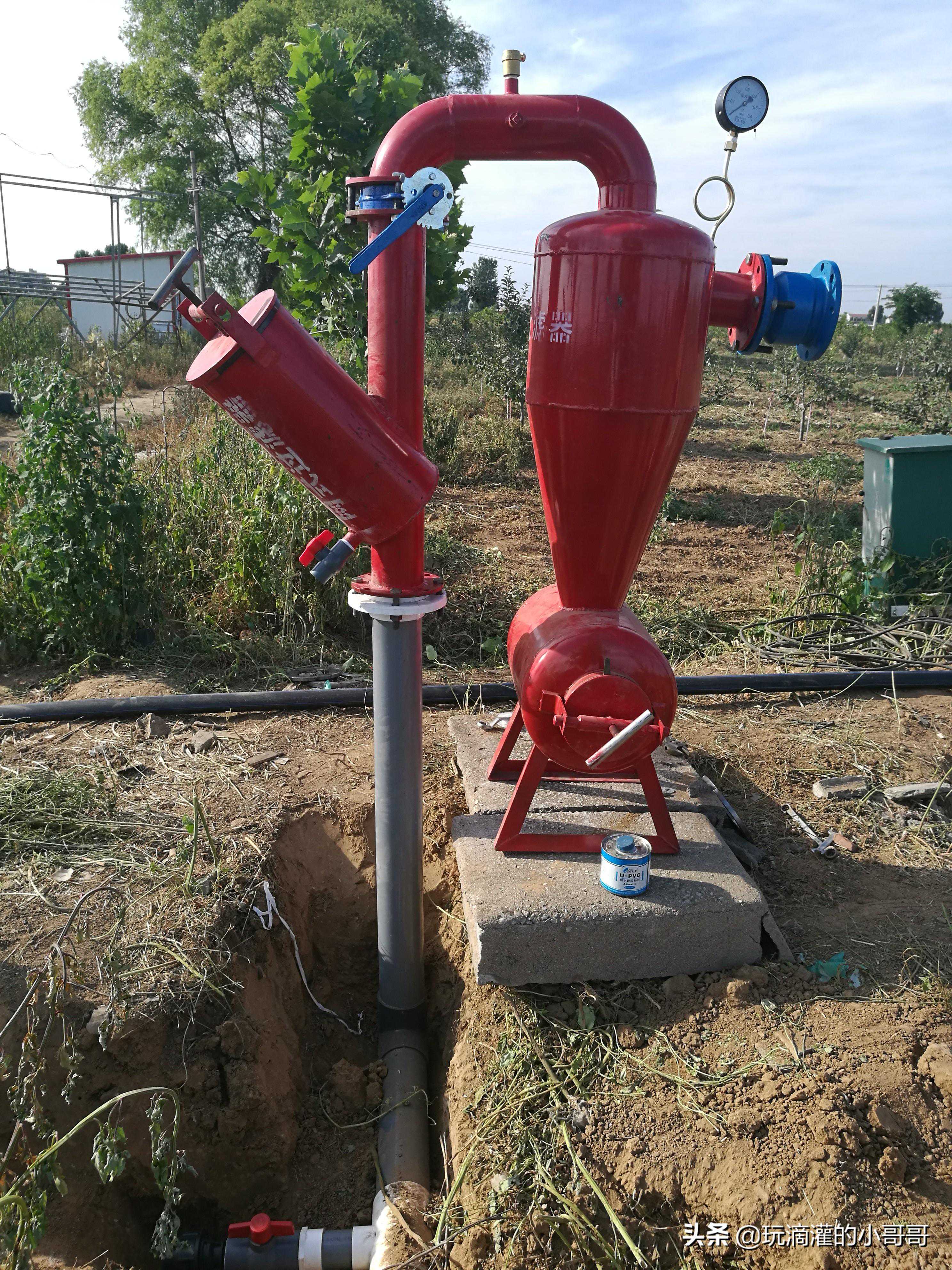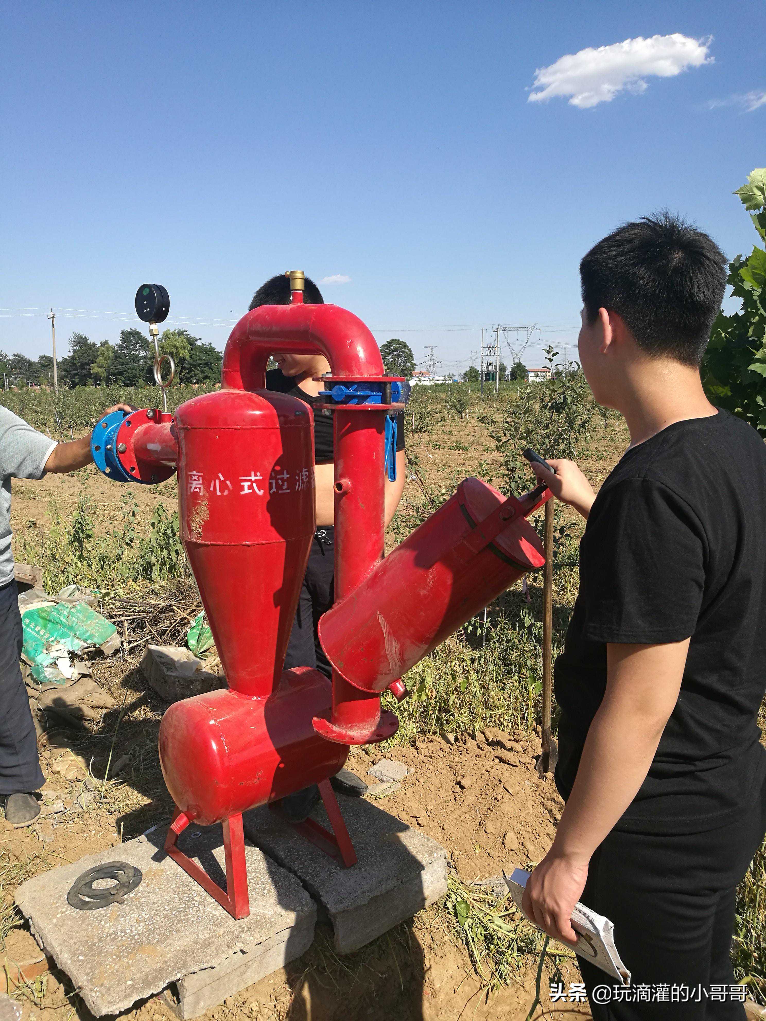 离心式过滤器通常安装在滴灌系统的首部,安装前地面需要经过硬化处理。过滤器进水口通过管道和逆止阀与潜水泵相连,出水口通过管道和阀门与过滤器相连接。法兰连接处加密垫,过滤器进,出水口处各安装一个压力表,过滤器要摆放平稳,安装完毕后做试压处理,在额定压力下所有连接处不得有漏水现象。
