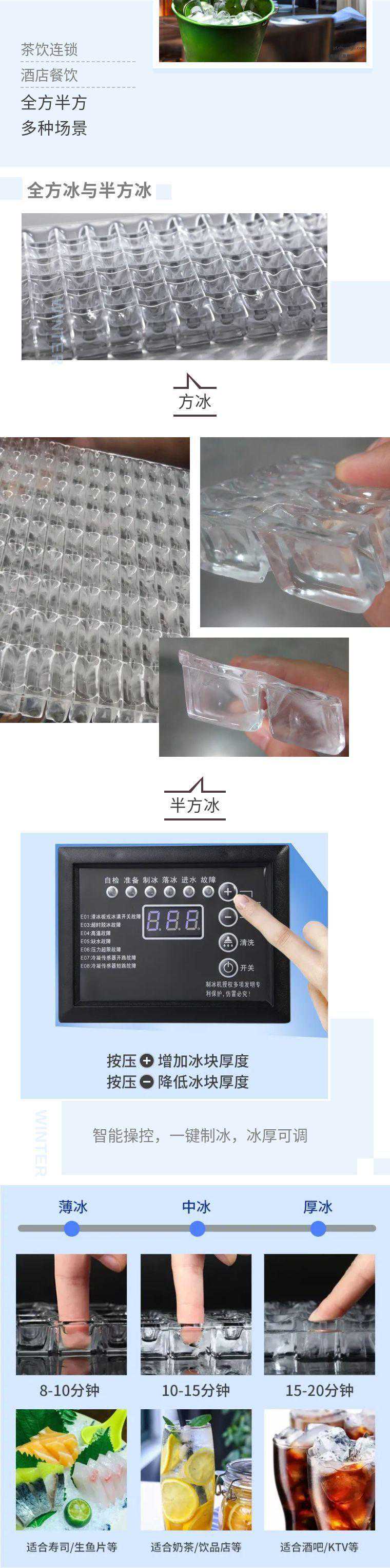 方冰或者半方冰采用的是传统的流水式成冰原理,从而使得冰块能够在短时间内凝结成冰,因此能够提供足够数量的冰块来满足客户的需求。创历采用纯铜镀镍蒸发盘,制冰更快速,冰晶剔透,省时省电。因此受到了很多的餐饮门店的青睐。冰块的冰镇要求相对简单,对于饮品在10-15分钟不受影响即可。
