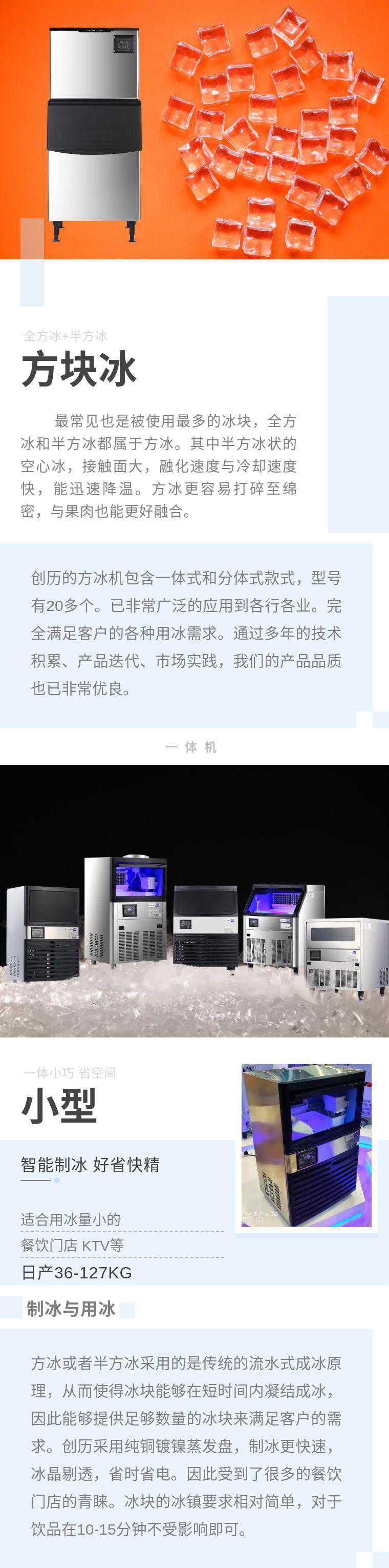 创历的方冰机包含一体式和分体式款式,型号有20多个。通过多年的技术积累、产品迭代、市场实践,已非常广泛的应用到各行各业。产品品质优良,畅销世界各地,完全满足了客户的各种用冰需求。