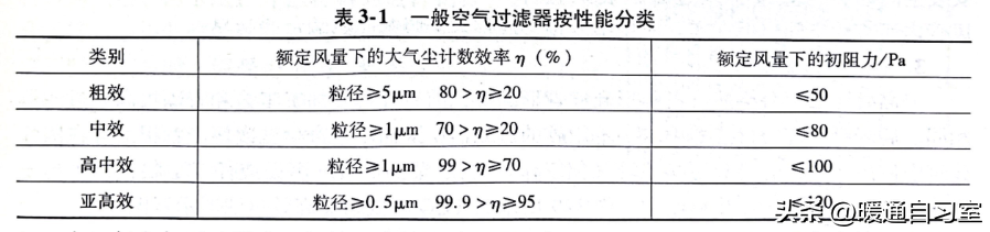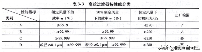 在一般的通风工程中,粗效过滤器和中效过滤器比较常见,只有在净化工程中才会经常涉及到高中效过滤器、亚高效过滤器和高效过滤器。关于粗效过滤器、中效过滤器、高中效过滤器、亚高效过滤器的性能分类,大家可以参照下表,这里就不再进行更深一步的讲解。