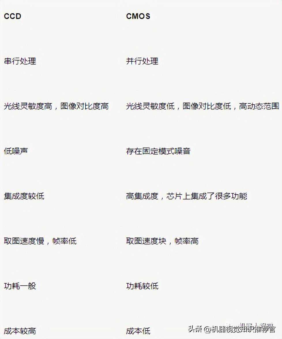 CMOS相机:使用CMOS感光芯片为图像传感器的相机,将光敏元阵列、图像信号放大器、信号读取电路、模数转换电路、图像信号处理器及控制器集成在一块芯片上,还具有局部像素的编程随机访问的优点。