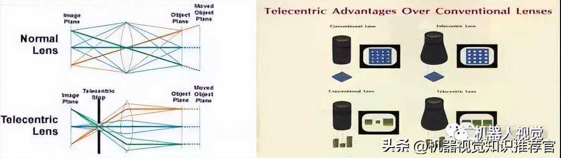 在测量系统中,物距常发生变化,从而使像高发生变化,所以测得的物体尺寸也发生变化,即产生了测量误差;即使物距是固定的,也会因为CCD敏感表面不易精确调整在像平面上,同样也会产生测量误差。采用远心物镜中的像方远心物镜可以消除物距变化带来的测量误差,而物方远心物镜则可以消除CCD位置不准带来的测量误差。