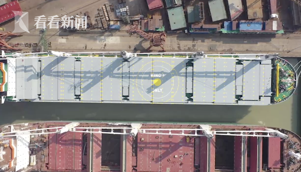 据悉,作为目前世界载重吨位最大多用途重吊船,“泰兴”轮长199.9米,宽32.26米,型深19.3米,满载吃水13.5米,设有5个大开口货舱,可灵活装载各种尺寸重大件设备货,大载重吨和箱型结构设计适用普通干散货运输,对于进口货源揽取同样具备优势。看看新闻Knews记者在现场看到整个甲板相当于14个标准篮球场的大小,同时甲板表面非常平整,方便装载大型风电叶片等机械设备,同时,在甲板上还预留的一个个黄色的集装箱箱脚,方便安放集装箱,真正体现多功能的用途。