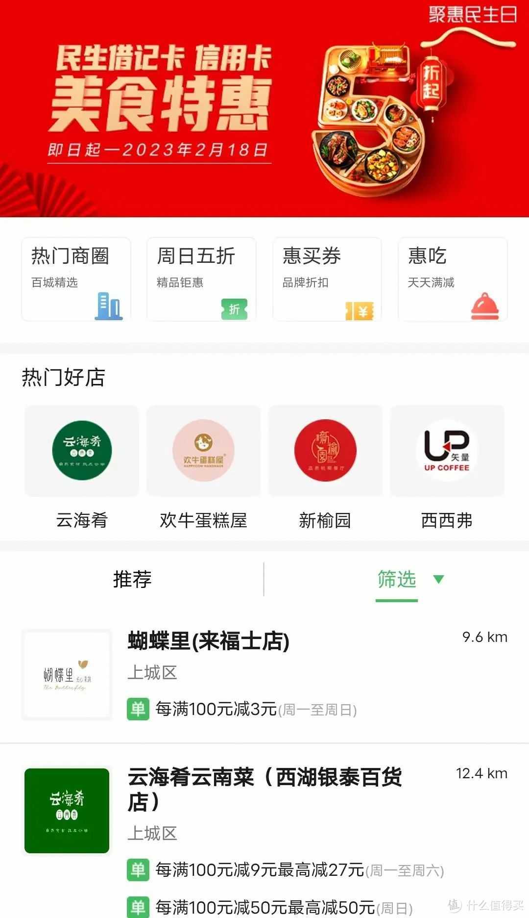 每周日,民生银行信用卡:“全民生活”app-生活-惠买单,虽然民生吃喝优惠支持的商户数量没有前面几家多,但懂得避开锋芒,选择周日作为主战场。