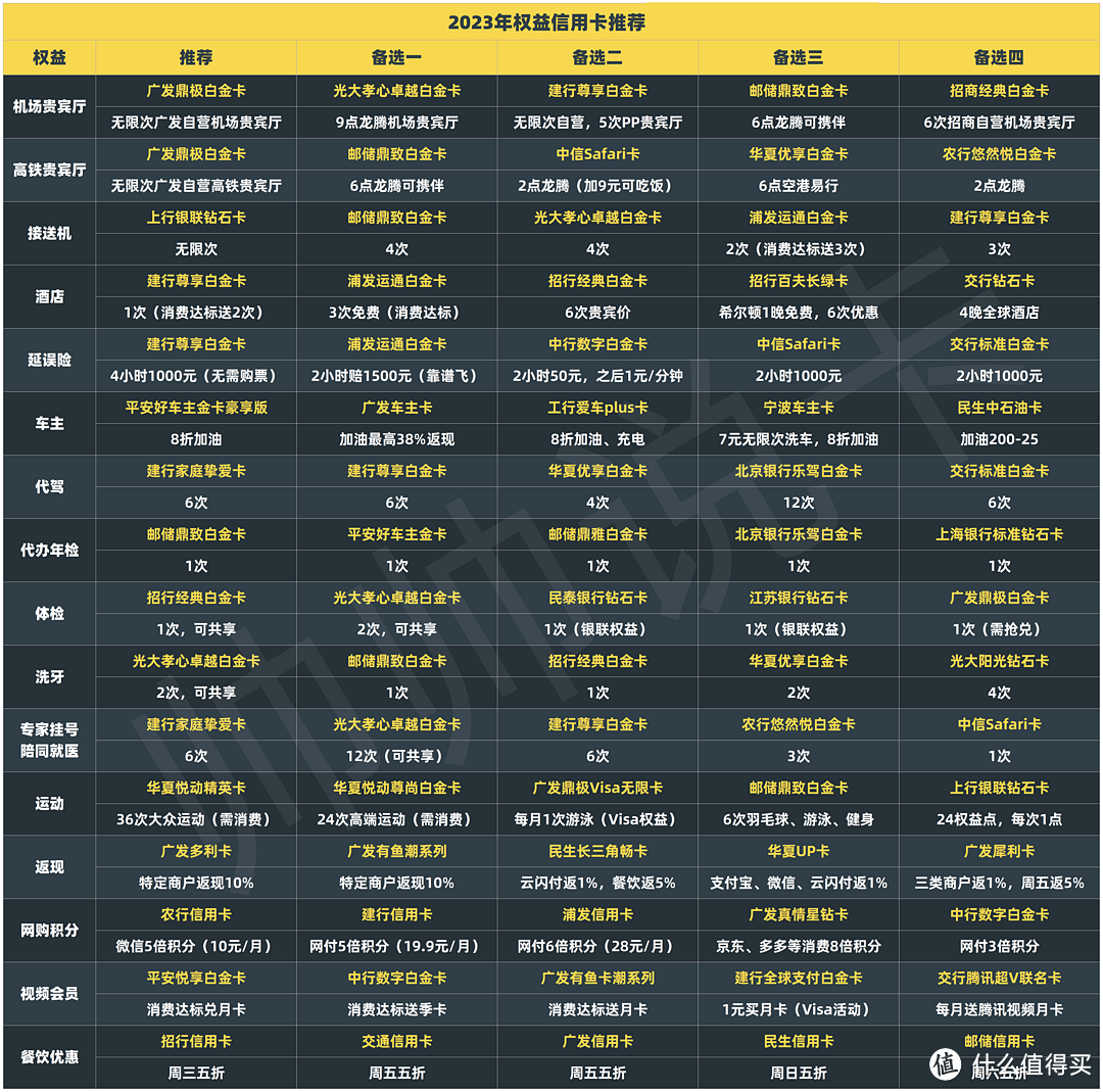 Part3.权益划分,卡片归类最后按权益划分推荐卡片,咱们就不一一展开细聊了,直接用表格总结吧: