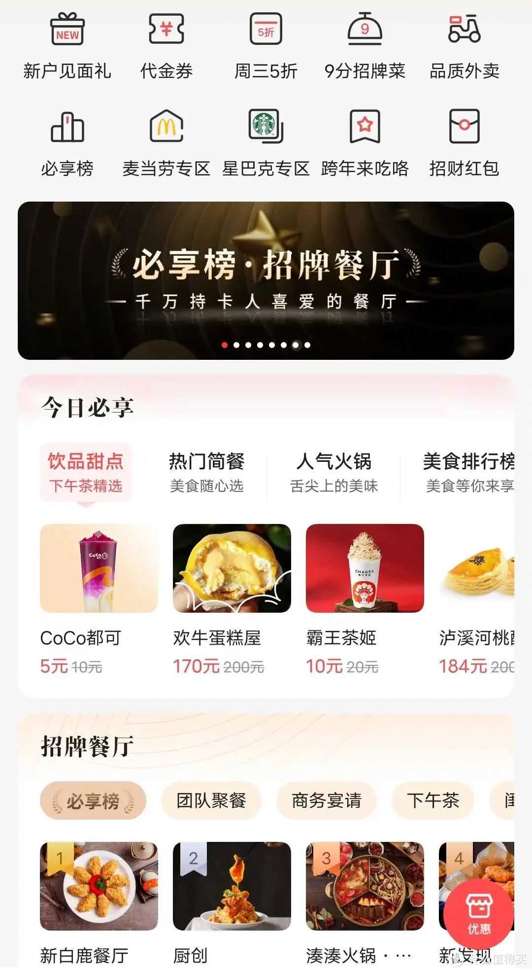 每周三,招商银行信用卡:虽然招行这两年用卡活动不多,但自己的招牌“周三5折”做得还是不错的。通过招商银行信用卡app“掌上生活”进入“饭票”频道,可以优惠折扣购买餐饮代金券,而每周三,折扣力度能达到最大,一般可以实现半价购买。