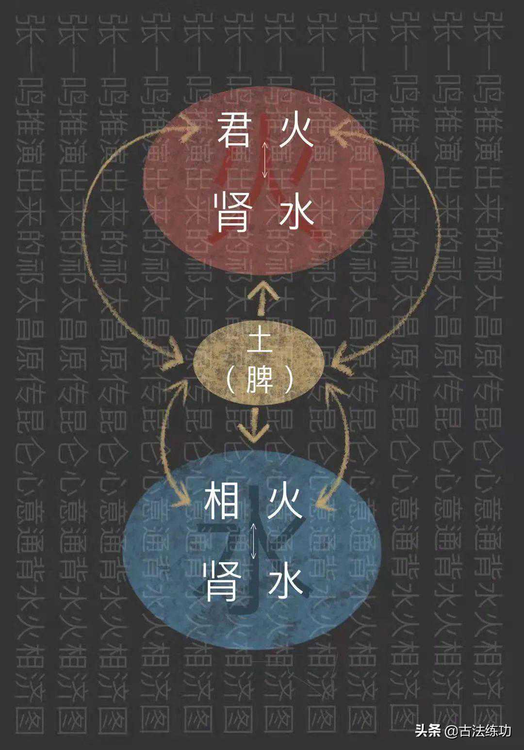 上伸肩行的是血,梳的是筋脉,走的是长,成就的是猿臂之长,得夺臂之势。‘少阴以君火主令’,‘足少阴肾,水也,水火异气,而以君火统之’,上伸肩调动刚刚所说的小阴阳(火)下降,也就是它自己里面的君火下找肾水,肾水上找君火,这个统称为“火”,因此君火为火中之火。这是它的火降,这个火降是指上伸肩与下伸肩所构成的大水升火降的火降,而非上伸肩自身水升火降里的小火降。