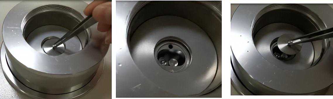 8、打开DSC炉体(保证为室温),用镊子将盛有试样的坩埚置于炉体中试样托盘上,另取一相同的空坩埚置于参比托盘上,用作参比。盖上炉盖。