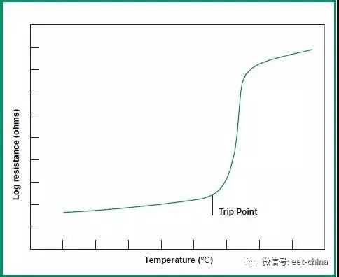 上图是PTC的阻抗温度特性,当过流的时候PTC发热,温度迅速上升,PTC的阻抗迅速变大,形成断路,断路后电流下降,发热减少,温度下降,PTC恢复低阻抗。因此,PTC非常适合短时过流。