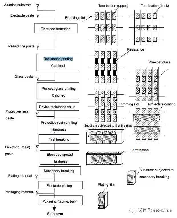 厚膜电阻采用的丝网印刷法,就是再陶瓷基底上贴一层钯化银电极,然后在电极之间印刷一层二氧化钌作为电阻体。厚膜电阻的电阻膜通常比较厚,大约100微米。具体工艺流程如下图所示。