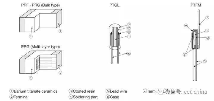 陶瓷PTC,其电阻材料是一种多晶体陶瓷,是碳酸钡、二氧化钛等多种材料的混合物烧结而成。PTC温度系数具有很强的非线性,当温度超过一定阈值时电阻会变得很大,相当于断路,从而可以起到短路和过流保护的作用。