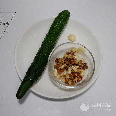 2、青瓜洗净切成薄片。大蒜去皮切片。坚果拜成小块