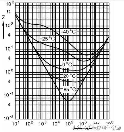 由图可知,随着频率的升高,容抗下降、感抗上升,容抗等于感抗并相互抵消时的频率为铝电解电容器的谐振频率,这时的阻抗最低,仅剩下ESR。如果ESR为零,则这时的阻抗也为零;频率继续上升,感抗开始大于容抗,当感抗接近于ESR时,阻抗频率特性开始上升,呈感性,从这个频率开始以上的频率下电容器时间上就是一个电感。