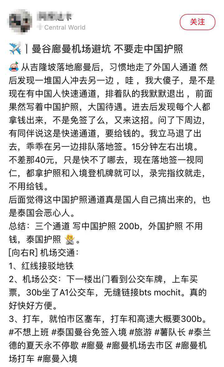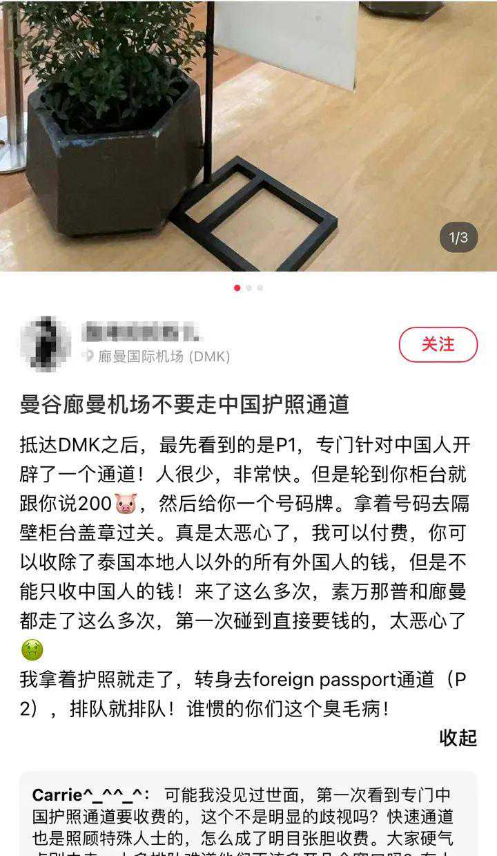 原来,有网友发现在机场过泰国海关前除了可以走普通的“foreigner(外国人)”通道正常入境外,旁边还有一条竖着“中国护照”标识的“专用”通道。当看到普通通道排队人多时,不少中国游客会下意识地走进“专用”通道,过关速度确实快了,但会被额外收取200泰铢的费用,而走“foreigner”通道入境时则不会收取任何费用。