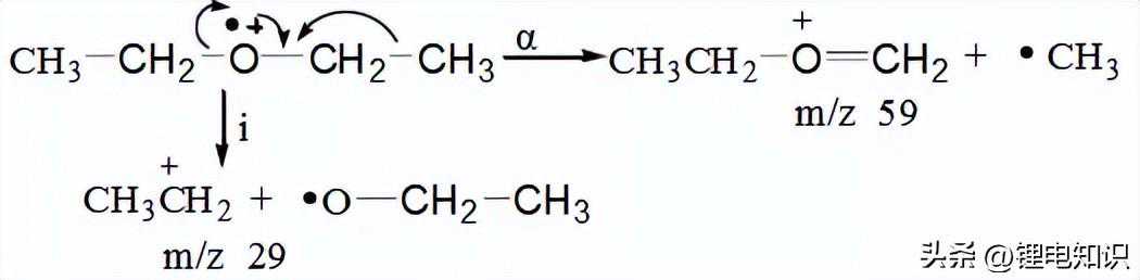 表现在质谱中,相应α断裂的离子峰强,i断裂产生的离子峰较弱。例如乙醚,i断裂和α断裂同时存在,α断裂的几率大于i断裂。但由于α断裂生成的m/z59还有进一步的断裂,因此在乙醚的质谱中,m/z59并不比m/z29强。
