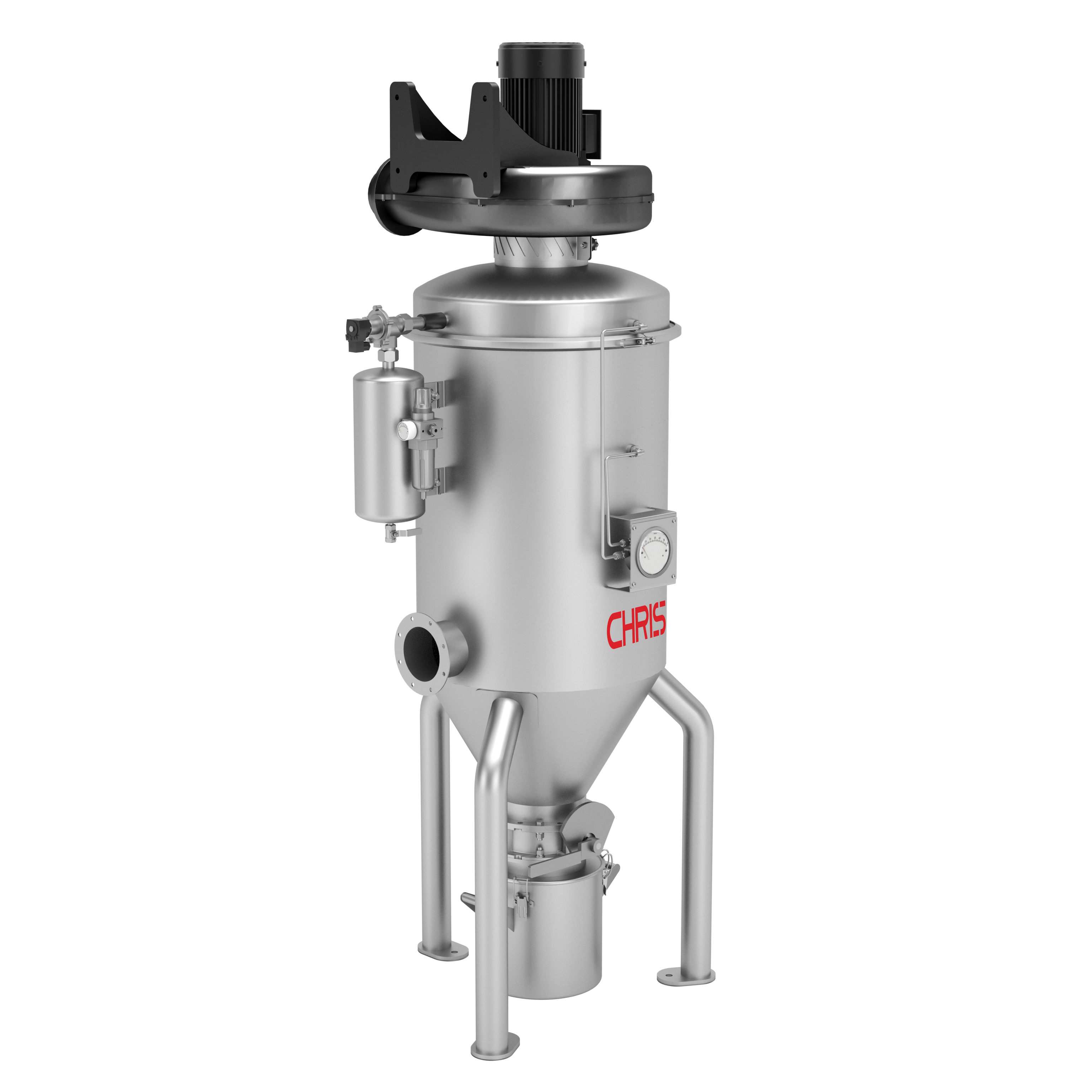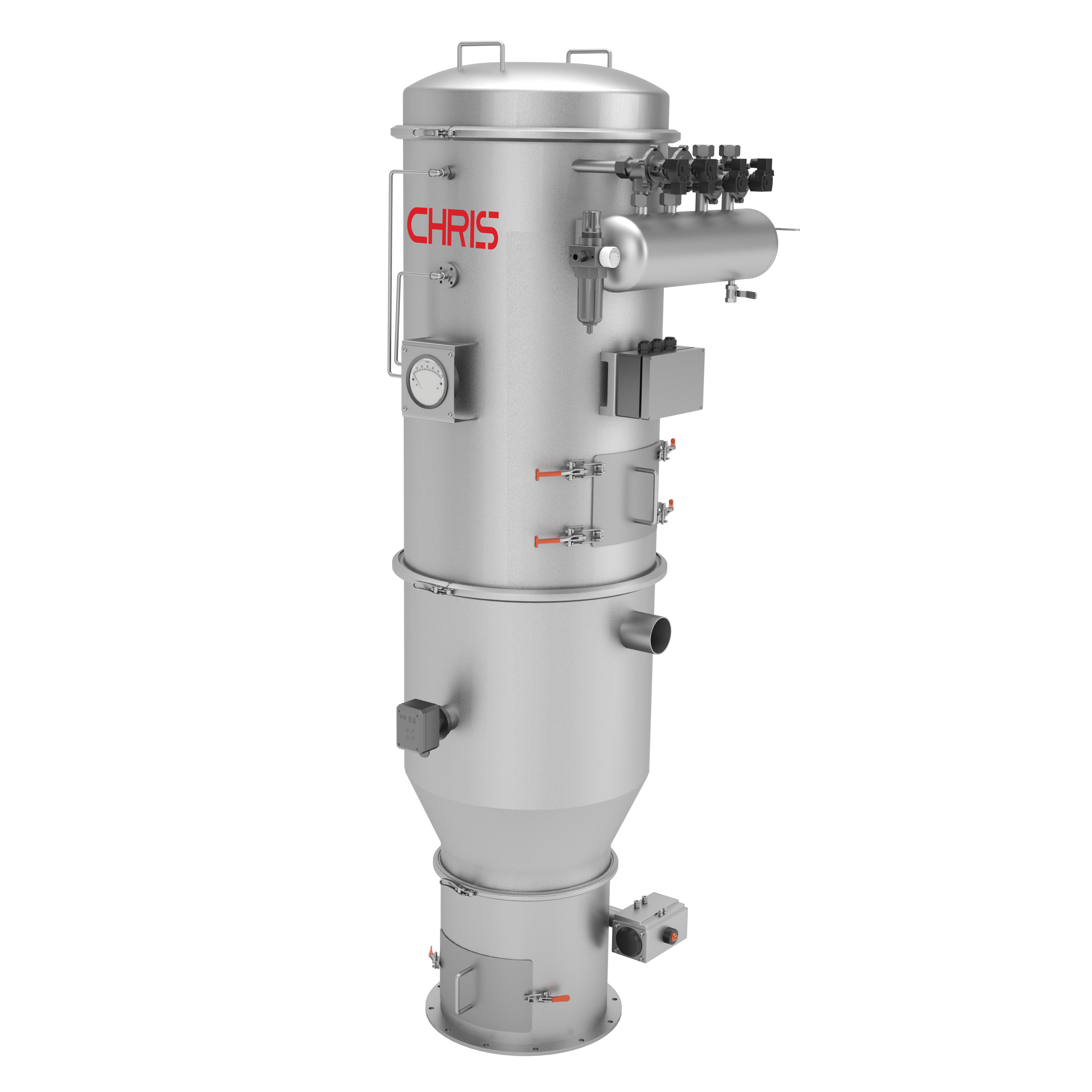 2、在真空输送设备料仓部分的上端安装有一套过滤器系统,过滤器系统上配有HD-PE烧结式过滤器或不锈钢过滤器或者Ti07过滤器(根据物料特性及最小颗粒度而定),过滤器主要作用是防止物料被抽吸进真空泵,当物料被抽吸进料仓中时过滤器将空气与物料进行分离,空气通过真空泵被排放出去,而物料则被收集在料仓中。