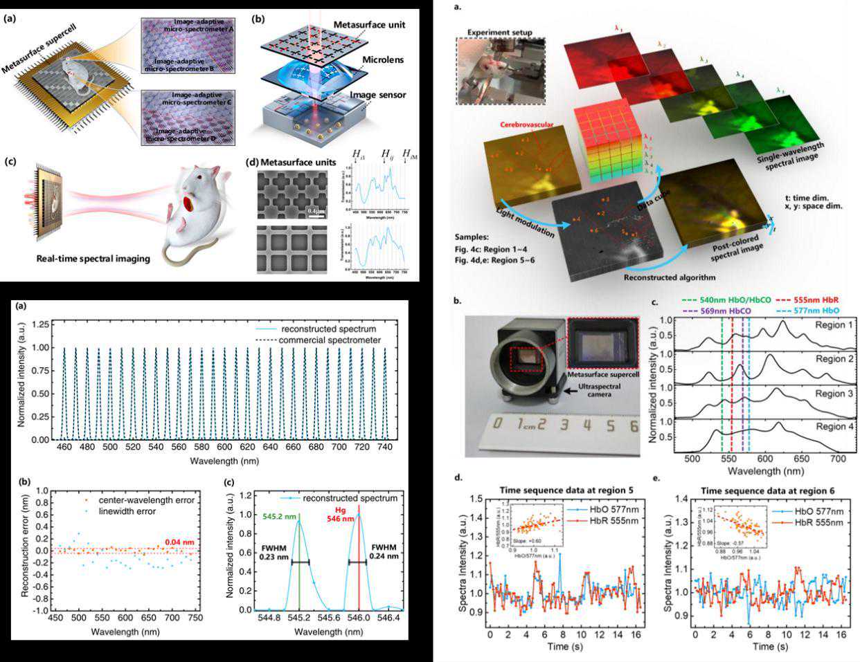 研究团队与清华大学生物医学工程系洪波教授团队合作,基于该实时超光谱成像芯片,首次测量了活体大鼠脑部血红蛋白及其衍生物的特征光谱的动态变化,时间分辨率高达30Hz(赫兹)。通过实时光谱成像,可获取大鼠脑部不同位置的动态光谱变化情况,结合血红蛋白的特征吸收峰,分析获取对应血管区和非血管区血红蛋白含量的变化情况,并可利用神经血氧耦合的机制,得出脑部神经元的活跃状态。