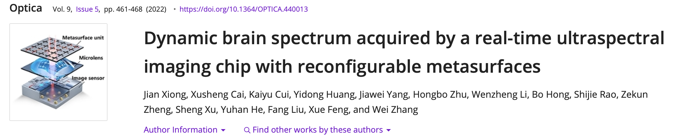 《科学》(Science)综述论文“光谱仪的小型化”将前述超光谱成像芯片技术列为该领域最新研究成果。
