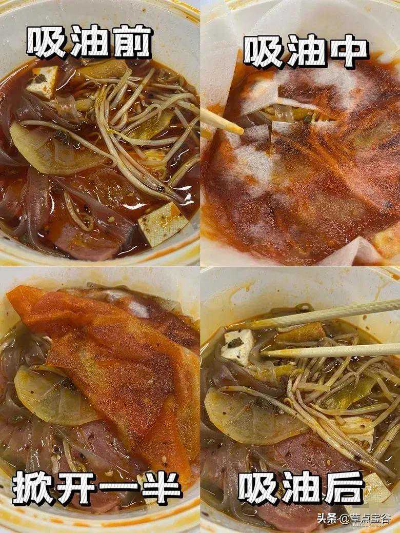 接着,用了两张吸油纸之后,麻辣烫变成这样,仔细看,油脂基本看不见了,好像真的清爽了很多。