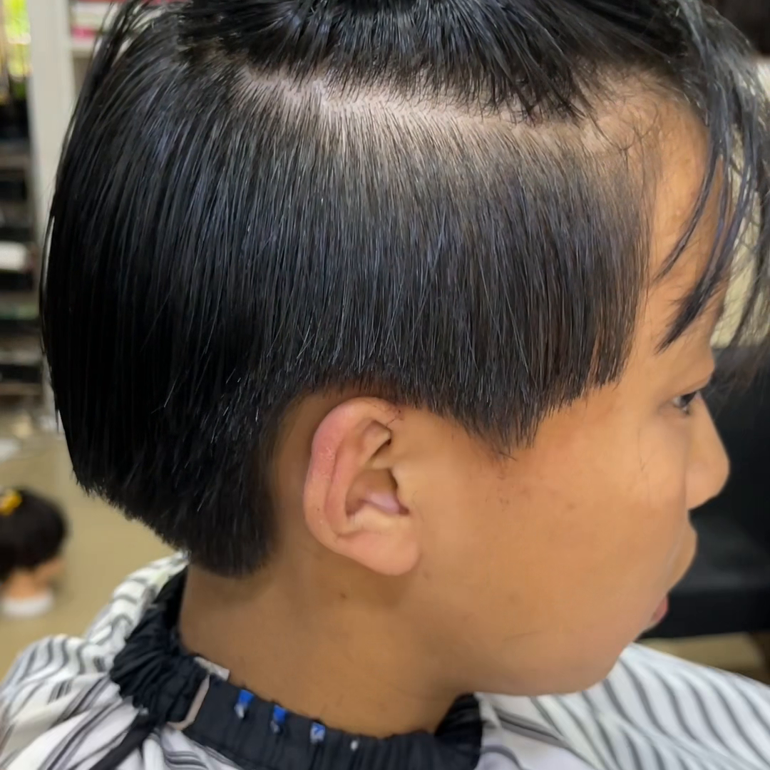 ·第三步,两侧是缓冲梳,定型出长度之后再以刀头反向清理干净。另外一侧同样反梳切出长度之后,再用刀头反向切干净底线。两侧的注意看很简单,先横着来一下,然后再斜着来一下。