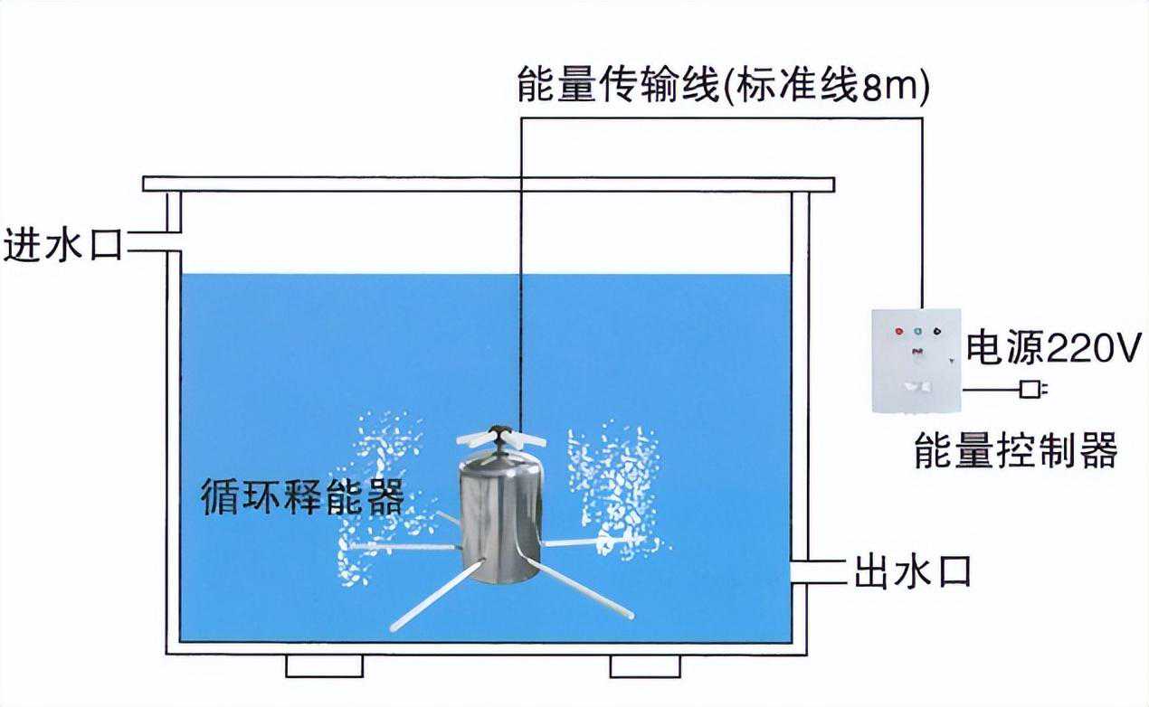 内置式消毒器的释放器放置在水箱、水池底部中间,所附控制电缆与能量控制器相连,安装时不需要破坏水箱、水池和原有的管路系统。