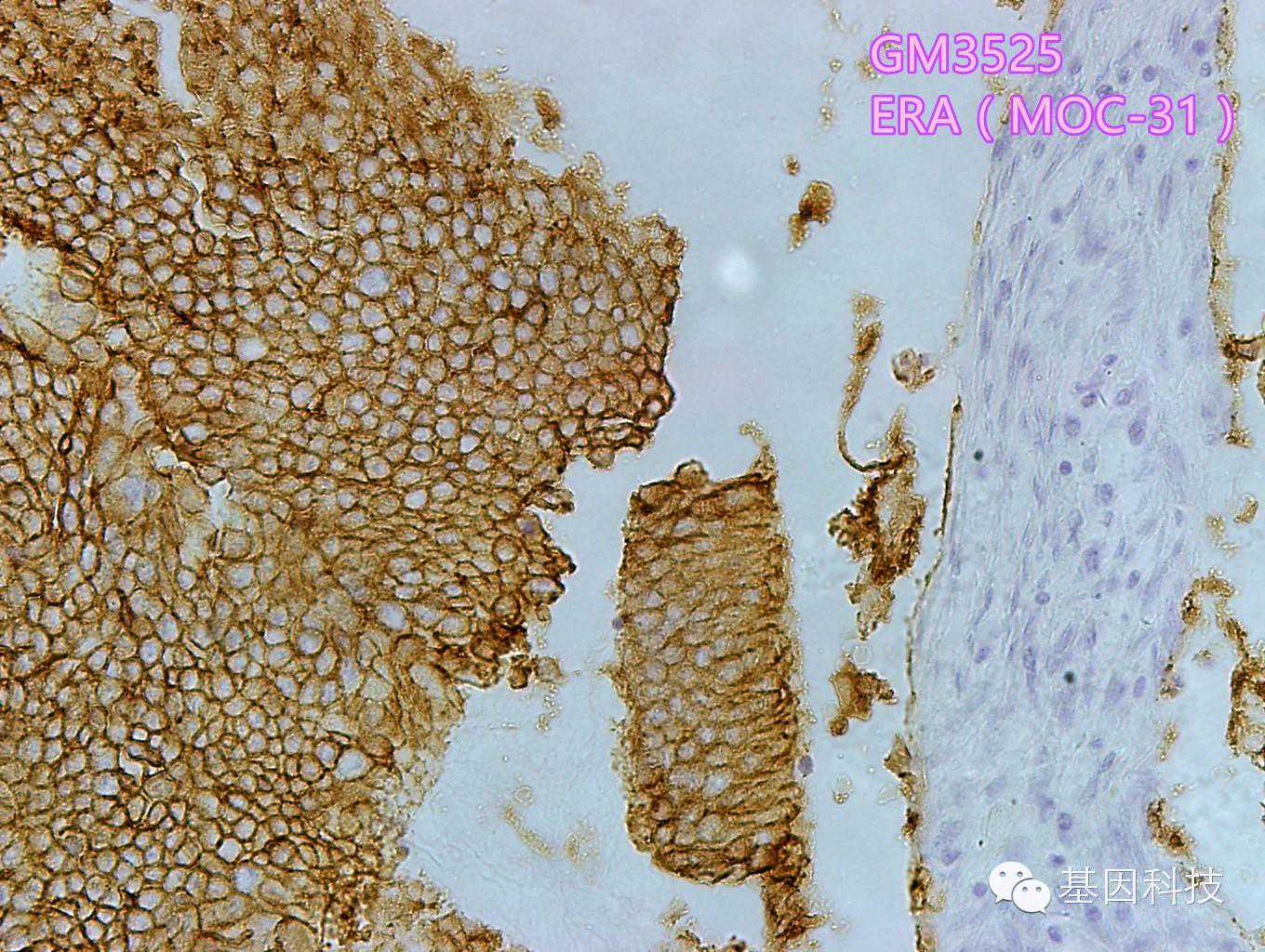 鼠抗人上皮相关性抗原(克隆号:MOC-31)可以和位于大多数腺上皮和源于这些上皮的肿瘤细胞的跨膜糖蛋白相结合。该抗体用于从间皮瘤和肝细胞癌的中区分腺癌,同时也可用于从间皮瘤中区分卵巢浆液性癌。